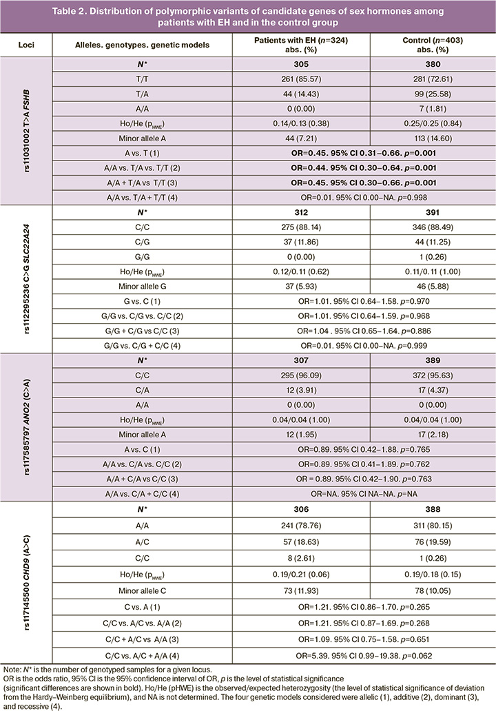 Results: An association was found between SNV rs11031002 T>A in FSHB and EH across the three genetic models (p=0.001 and pperm=0.001): OR=0.45, 95% CI 0.31–0.66 (allelic model); OR=0.44, 95% CI 0.30–0.64 (additive model); OR=0.45, 95% CI 0.30–0.66 (dominant model). The minor allele A of SNV rs11031002 T>A in FSHB demonstrated a protective effect against disease development (OR<1). Additionally, SNV rs11031002 T>A in FSHB and five polymorphic loci (rs11031005, rs11031006, rs11031010, rs74485684, rs10835638) in linkage disequilibrium with it exhibit significant functionality, influencing the interaction of the FSHB gene promoter with 38 transcription factors and affecting the transcription level of the ARL14EP gene in subcutaneous adipose tissue.