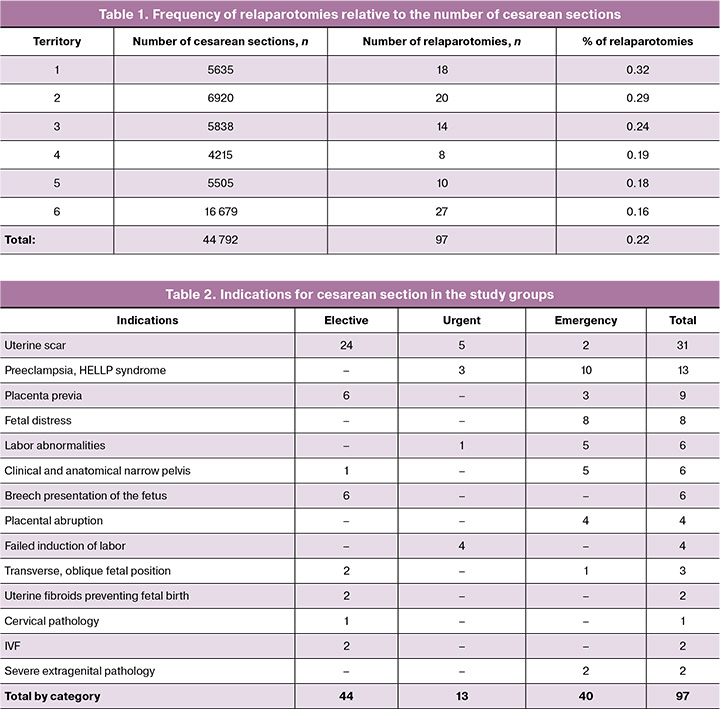 Materials and methods: A multicenter cross-sectional descriptive study was conducted to analyze the clinical and anamnestic data along with treatment outcomes of 97 cases of relaparotomy due to bleeding after cesarean section, which occurred in secondary- and tertiary-level maternity hospitals. Data were collected from six regions of the Russian Federation over three years, from January 1, 2022, to December 1, 2024: n=20, n=27, n=14, n=8, n=18, and n=10.
