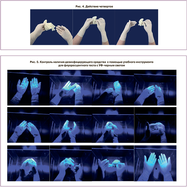 Исследования, проводившиеся с использованием учебного пособия для тестирования УФ-черным светом, установили, что при соблюдении всех требований безопасного снятия медицинских перчаток, обеспечивается отсутствие дезинфицирующего средства на второй паре перчаток (рис. 5).