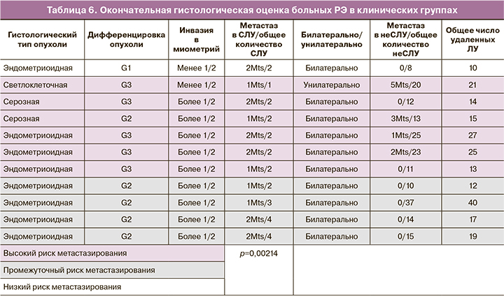 Вся выборка пациенток была разделена на 3 группы относительно риска метастазирования первичной опухоли в регионарные ЛУ: высокий, промежуточный и низкий – по рекомендациям Европейского общества онкогинекологов (ESGO,2017). В группу высокого риска вошли пациентки с агрессивным гистологическим типом опухоли (серозная и светлоклеточная карциномы), аденокарцинома с низкой дифференцировкой опухоли, большими размерами и глубокой инвазией опухоли в миометрий. К промежуточному риску отнесли пациенток, у которых наблюдался эндометриоидный тип опухоли с умеренной дифференцировкой, а также расположение опухоли в верхней трети полости матки и глубокая инвазия в миометрий. Пациентки, входящие в группу низкого риска, имели высокую или умеренную дифференцировку опухоли с поверхностной инвазией в миометрий