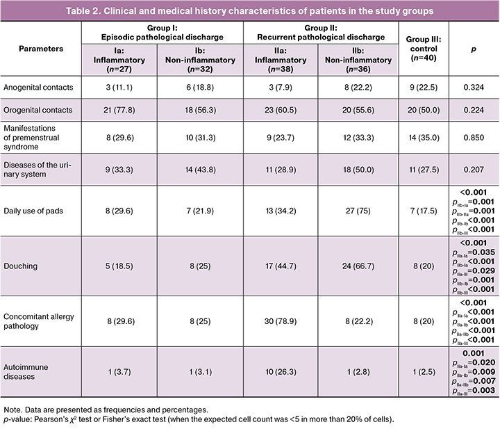 Three groups were identified: group I, episodic pathological discharge (n=59); group II, recurrent (≥3 episodes per year, n=74); and group III, comparison group (healthy women, n=40). Groups I and II were subdivided based on the presence of inflammation: subgroup "a" (inflammatory: leukocytosis, itching, hyperemia) and subgroup "b" (non-inflammatory, without inflammation). Thus: Ia – episodic inflammatory (n=27), Ib – episodic non-inflammatory (n=32), IIa – recurrent inflammatory (n=38), IIb – recurrent non-inflammatory (n=36). This allowed us to study the impact of recurrence rate and current inflammatory status simultaneously.
