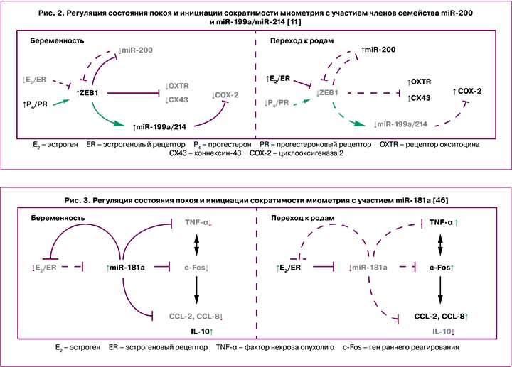 В последнее время активно изучается роль мкРНК в патогенезе осложнений, возникающих во время беременности, преждевременных и самопроизвольных родах. Кроме того, они рассматриваются в качестве важных регуляторов, принимающих участие в переходе миометрия из рефрактерного в состояние сократимости [11, 23, 41, 42]. В частности, во время инициации родовой деятельности в миометрии повышается экспрессия членов семейства miR-200 (miR-200b/200a/429, miR-141/200c), которые ингибируют соответствующие гены-мишени – транскрипционные факторы ZEB1 и ZEB2 [41]. При этом, высокие уровни прогестерона во время беременности поддерживают повышенную экспрессию ZEB1, что способствует подавлению экспрессии miR-200 [41]. Соответствующее снижение уровня прогестерона и функции PR к моменту наступления родов, а также увеличение активности циркулирующего эстрадиола и рецепторов эстрогенов-α вызывает подавление экспрессии ZEB1 и индукцию экспрессии семейства miR-200, дополнительно ингибирующего уровни ZEB1 и ZEB2, что приводит к активации генов, ответственных за сокращение миометрия, – OXTR и GJA1. Кроме того, miR-200a принимает участие в усилении местного метаболизма прогестерона до неактивных продуктов и в снижении функции PR в миометрии во время перехода к началу родовой деятельности [23].