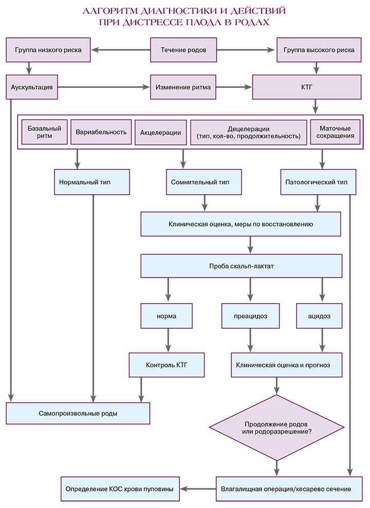 Дистресс плода – клинические и/или лабораторно‑инструментальные признаки, указывающие на нарушение нормального состояния плода, наиболее вероятно обусловленные временной или постоянной кислородной недостаточностью (также не исключены другие причины, например, интоксикация, гиперили гипотермия, медикаментозное воздействие и др.), что может привести к его гипоксии. К таким признакам относятся замедление роста, изменение двигательной активности и сердечного ритма плода, мекониальные воды.