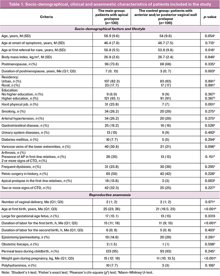 Materials and methods: A clinical retrospective case-control study analyzed medical records data of 230 patients with pelvic organ prolapse who underwent examination and treatment in the period from 2017 to 2024 at the University Clinic "I am healthy!" The main group was composed of 130 patients with apical prolapse, and the control group was composed of 100 patients without apical prolapse (with prolapse of the anterior and/or posterior vaginal wall).
