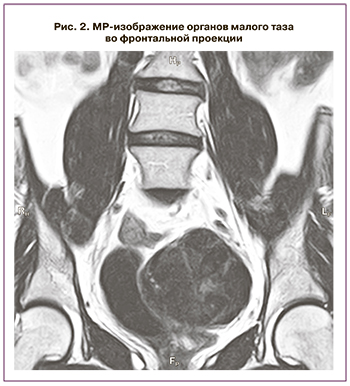 Во время операции были визуализированы маточные рудименты с обеих сторон, два яичника и маточные трубы. Послеоперационный период протекал без особенностей. Неовлагалище после проведенной операции имело длину 10–12 см, пациентка жила регулярной половой жизнью. Проходила плановые ежегодные осмотры гинеколога по месту жительства. Во время очередного осмотра, спустя 19 лет после оперативного лечения, пациентка пожаловалась на тянущие боли внизу живота и дискомфорт при половой жизни. При бимануальном исследовании в малом тазу определялось образование размерами до 12–15 см, плотной консистенции с четкими границами.
