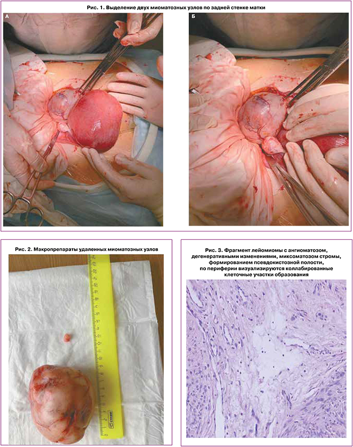 Описание операции: под спинальной аналгезией после трехкратной обработки хирургического поля бетадином, лапаротомическим доступом по Пфанненштилю послойно вскрыта брюшная полость. Ревизией установлено: матка увеличена до 16 недель беременности за счет беременности, в нормотонусе. По задней стенке ближе к нижней трети матки определяется субсерозный миоматозный узел диаметром 8 см (рис. 1). Правая и левая маточные трубы не изменены, фимбрии выражены. Правый яичник размерами 4×2 см с обычной белочной оболочкой, левый яичник размерами 3,5×2 см с обычной белочной оболочкой. По наибольшему полюсу узла по задней стенке произведен продольный разрез, вылущен субсерозный миоматозный узел с вторичными изменениями без вскрытия полости матки, затем из толщи миометрия по продолжению ложа удаленного узла удален миоматозный узел 2,5 см, ложе ушито отдельными викриловыми швами. Миоматозные узлы отправлены на гистологическое исследование (рис. 2). Выполнено дренирование брюшной полости через контрапертуру справа дренажной трубкой Ch/Fr 30. Брюшная стенка восстановлена, ушита послойно. Кровопотеря составила 500 мл. Интраоперационно введен цефазолин 2 г внутривенно однократно. В раннем послеоперационном периоде введен трамадол 2,0 внутримышечно однократно на 1-е сутки после операции.