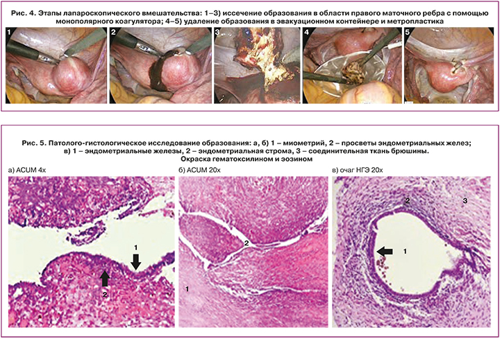 Выполнена операция: Лапароскопия, иссечение образования ACUM без вскрытия полости матки, метропластика. Иссечение и коагуляция очагов наружного генитального эндометриоза (рис. 4). В ходе лапароскопической операции визуализировалось тело матки размерами 8,0×4,5×4,0 см, деформированное ближе к правому трубному углу большим образованием 5×6 см, исходящим из передне-боковой стенки матки. Правая маточная труба просматривалась на всем протяжении нормальной окраски, фимбриальный отдел свободен, фимбрии выражены, труба проходила по задней стенке аденомиозного узла. Правый яичник без видимой патологии размерами 3,0×4,0×3,4 см, имелось желтое тело со стигмой. Левая маточная труба просматривалась на всем протяжении нормальной окраски, фимбриальный отдел свободен, фимбрии выражены. Левый яичник был размерами 3,5×2,7×3,3 см с капсулой белесоватой окраски. На правой и левой крестцово-маточных связках, в Дугласовом пространстве, на брюшине пузырно-маточного углубления обнаружены множественные очаги эндометриоза 0,2–0,5 мм.