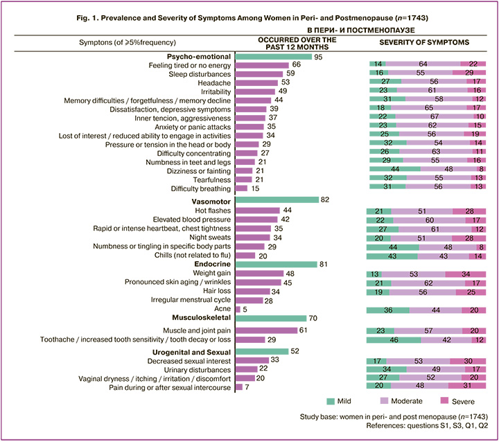 Among peri- and postmenopausal women (n=1,743), 95% reported experiencing psycho-emotional symptoms within the past 12 months. Fatigue was noted by 66% of respondents, while sleep disturbances were reported by 59%. According to the Greene Climacteric Scale, these symptoms were classified as moderate to severe in 86% and 84% of cases, respectively.
