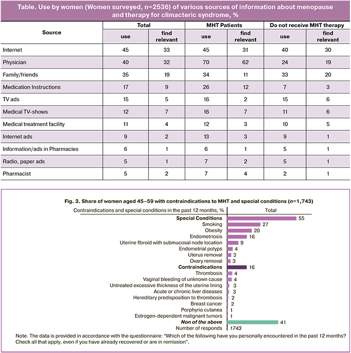 Results: The study revealed that 97.5% of women aged 45–59 years who were in the peri- and post-menopausal stages experienced at least one symptom of menopausal syndrome. The symptoms of menopause were rated as moderate or severe by 74% of patients. The women agree that their quality of life should not deteriorate during menopause (90%1). Endocrinological (55%) and vasomotor (56%) symptoms were often the cause for seeking medical help. Among all the medical professionals, the gynecologist was the primary source of knowledge (93%) about symptoms and therapy. However, gynecologists seldom initiated active discussions about menopause with their patients. Among women who went to the doctor at least once during menopause (n=845/1088), only 20% of women reported that the doctor was the first to initiate a conversation about menopause. Women who were aware of the appropriate treatment method perceived MHT as a therapy that totally relieves peri- and postmenopausal symptoms (49%) compared with non-hormonal therapy (36%) and combined oral contraceptives (23%). Most Russian women (67%) aged 45–59 years who associate health changes with the approach/onset of menopause and do not deny hormone therapy in the future preferred the oral route of MHT administration and only 9% of women chose the transdermal route. The need for information about MHT was reported by about 58% of women. The recommendation to discontinue MHT in 82% of cases (among all doctors) was given by the gynecologist. The lack of a doctor’s administration is also a significant barrier to MHT: the gynecologist did not prescribe MHT to women with severe menopausal symptoms in 21% of cases. Only 10% of women had absolute contraindications to MHT.