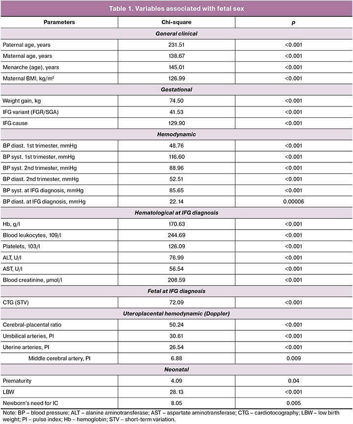 The formation of the maternal reproductive function (age at menarche), the maternal body weight characteristics – pregestational (BMI) and formed during pregnancy (weight gain), and age of both parents with the potential accumulation of epigenetic risk factors were associated not only with the IFG variant, but also with fetal sex. The design of this study did not allow us to convincingly assert the pathogenesis of this interaction and its probable influence. But it should be noted that the reactivity of the maternal hemodynamics (BP systolic and diastolic), starting from the I trimester of pregnancy, the fetal heart rate (CTG), uteroplacental blood flow, blood functions (Hb, leukocyte, platelet counts), liver (ALT and AST), kidneys (creatinine) with IFG of one of the variants, the need for earlier delivery, despite LBW or prematurity, the need for IC of the newborn, overlaps with fetal sex. A connection with fetal sex was found, even in the absence of a clear cause of IFG [22].