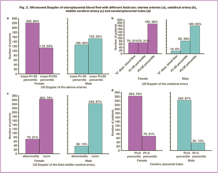 More specific for female fetuses was Doppler uterine abnormalities (mean PI>95th percentile) (220/333 versus 126/278, OR=2.35, 95% CI 1.69–3.26) and middle cerebral arteries ((PI<5th percentile) (70/333 versus 36/278, OR=1.79, 95% CI 1.15–2.77), as well as the cerebroplacental index (70/333 versus 36/278, OR=1.79, 95% CI 1.15–2.77); for males – Doppler violation of the umbilical artery (mean PI>95th percentile) (82/278 versus 70/333, OR=1.57, 95% CI 1.09–2.27).