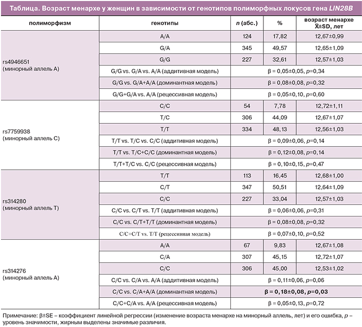 Для данного репликативного исследования были отобраны полиморфные локусы rs4946651, rs7759938, rs314280, rs314276 гена LIN28B, показавшие ранее в 6 GWAS исследованиях значимые ассоциации с возрастом менархе [20–24, 26]. Согласно материалам базы данных GeneCards:The Human Gene Database (http://www.genecards.org/) ген LIN28B (lin-28 homolog B) кодирует белок семейства LIN28, который участвует в регуляции синтеза микроРНК, вовлеченных в различные биологические процессы в организме (клеточный цикл, эмбриональное развитие, пубертатное созревание, процессы метаболизма, репродукции и др.).
