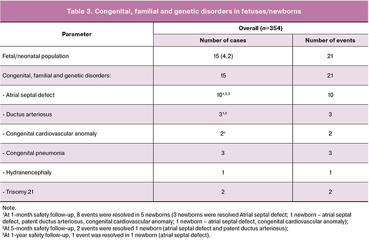 Among serious AEs were registered 21 events from ‘Congenital, familial and genetic disorders’ in 15/354 (4.2%) fetuses/newborns. Out of them, malformations and developmental abnormalities were registered in 13 (3.7%) fetuses/newborns: 2 fetuses and 11 newborns, and 3 reports of congenital pneumonia in 3 newborns. During the first year, all cardiac abnormalities resolved in 9 newborns spontaneously; 1 event was resolved by surgical treatment. In total, during the first year, all cardiac abnormalities were resolved (in 10 children).