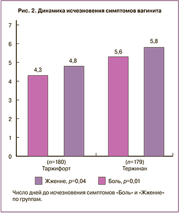 149-1.jpg (52 KB)Среднее время до исчезновения жжения в группе пациенток, принимавших препарат «Таржифорт», составило 4,8 (3,03) дня, а в группе пациенток, принимавших препарат «Тержинан», – 5,8 (3,63) дня, т.е. на 1 день быстрее в группе «Таржифорт», p=0,04 – данные также статистически значимы (табл. 3, рис. 2).