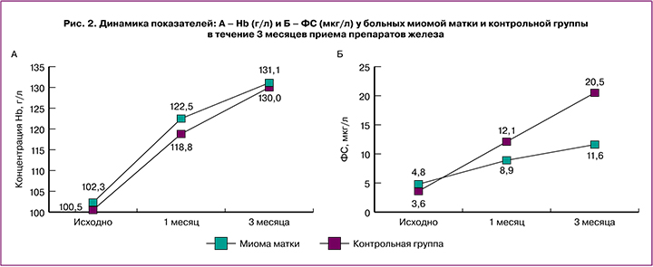 Из особенностей лечения хочется отметить результаты терапии пациенток с миомой матки (наиболее распространенной причиной развития анемии). В нашей группе пациенток с анемией 26/50 были с диагнозом миомы матки. Ответ на лечение данной группы мы сравнивали с остальными 24/50 пациентками с доброкачественными заболеваниями женской репродуктивной системы (группа контроля). Оценку результатов проводили по показателям Hb и ФС до, через 1 месяц, который является важным этапом принятия решения о дальнейшей тактике лечения (см. выше), и после окончания лечения (около 3 месяцев приема препарата «Сорбифер Дурулес»). При сравнении результатов терапии не получено различий по средним значениям Hb. Однако результаты восстановления средних значений ФС у больных с миомой матки оказались значимо ниже (11,6±2,6 мкг/л, ≈0,05), чем показатели ФС в группе контроля (20,5±4,3), и не достигли нормальных значений (рис. 2). Таким образом, доказано, что наличие пролиферативного, даже незлокачественного заболевания, в данном случае миомы матки, может значимо влиять на результаты лечения препаратами железа, подавляя его всасывание в двенадцатиперстной кишке, чувствительной к высокой концентрации гепцидина. Влияние миомы матки на кроветворение с помощью нарушения продукции ЭПО и высоких показателей гепцидина достоверно сказывается на результатах терапии.