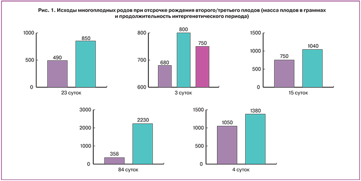 Таким образом, продолжительность интергенетического периода составила от 3 до 84 суток (рис. 1), что позволило существенно увеличить выживаемость плодов. Если из первых плодов выжил только один (родившийся с массой более 1000 г), то из плодов, родившихся после отсрочки, выжило пять, а погиб лишь один (рис. 2).