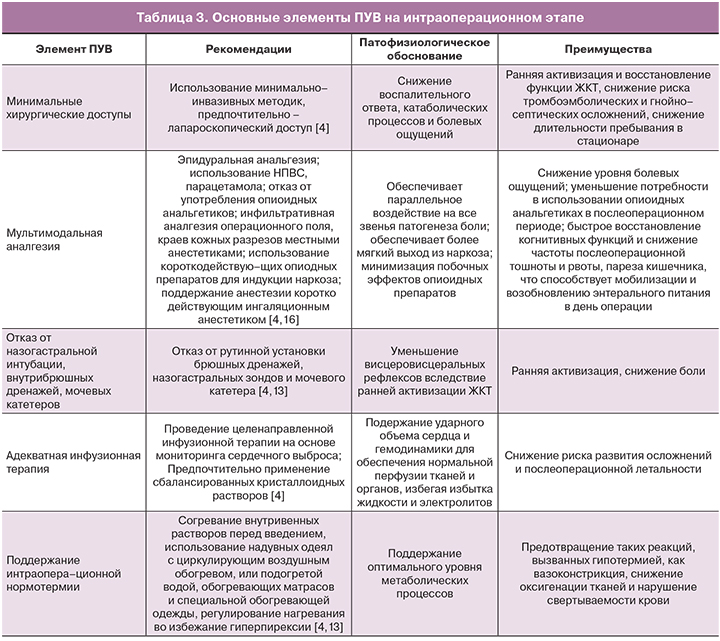 Основной задачей интраоперационного этапа является минимизация хирургического стресса, создание условий для ускоренного восстановления. Его элементы представлены в таблице 3.