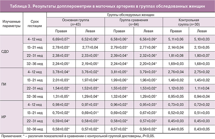 Проведение комплексного УЗИ при поступлении беременных с ОП позволило исключить акушерскую патологию по данным фето- и плацентометрии. Размеры эмбриона/плода соответствовали сроку гестации по аменорее, задержки роста плода и маркеров хромосомных аномалий развития плода не было выявлено ни в одном случае. Значимых различий по частоте локализации трофобласта/плаценты не обнаружено. Однако при измерении толщины плаценты обращали на себя внимание достоверное увеличение ее толщины во всех случаях и неоднородность структуры плацентарной ткани в 51,2% наблюдений. Кроме того, развитие ОП при беременности сопровождалось значимыми изменениями качественных параметров маточной гемодинамики: систоло-диастолическое отношение (СДО) возрастало и в правой, и в левой маточных артериях в 1,3 раза, пульсационный индекс (ПИ) – в 1,4 раза и индекс резистентности (ИР) – в 1,3 раза, что свидетельствует о нарушении маточно-плацентарного кровотока при данной патологии (табл. 3).