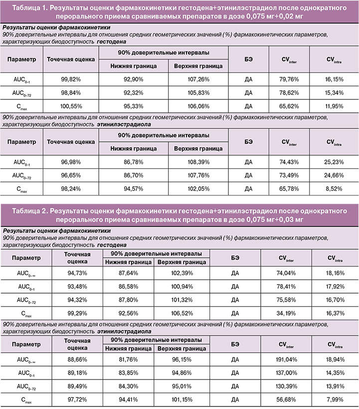 Препараты считались биоэквивалентными, если границы оцененного 90% доверительного интервала для отношений средних геометрических значений параметров AUC0-t и Cmax исследуемых и референтных препаратов гестодена+этинилэстрадиол и дроспиренона+этинилэстрадиол находились в пределах 80,00–125,00%.