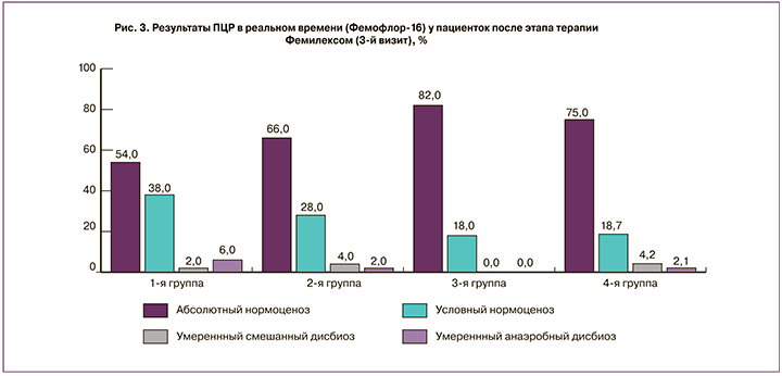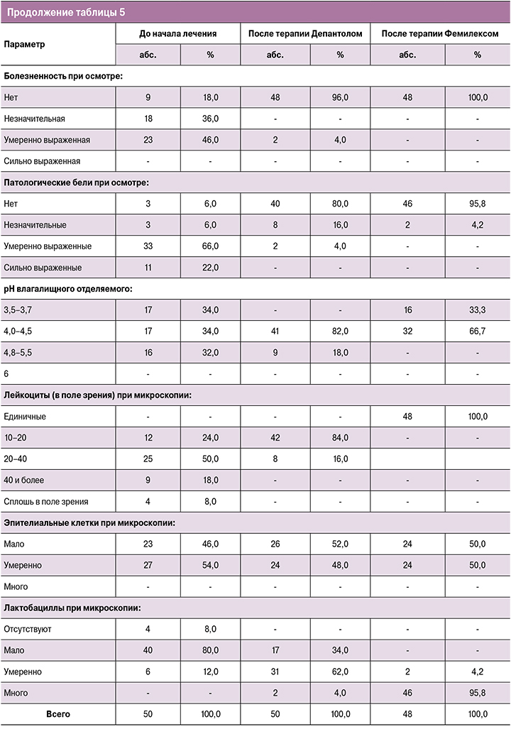 Все женщины получали терапию препаратом Депантол по 1 вагинальному суппозиторию 2 раза в сутки в течение 7 дней, далее, 2-м этапом – Фемилекс, по 1 вагинальному суппозиторию в сутки 10 дней. Общий курс лечения составлял 17 дней. В рамках исследования учитывали жалобы и поэтапно регистрировали данные объективного обследования и результатов лабораторных исследований в динамике до начала лечения, после терапии Депантолом, после окончания лечения Фемилексом, и далее через 30 дней и через 60 дней после окончания двухэтапной терапии. Оценивали состояние биоценоза влагалища и скорость его восстановления во всех 4 группах пациенток. Переменными эффективности терапии считали: субъективные параметры – жалобы пациентки (выделения из половых путей, зуд, боль, жжение, дискомфорт); объективные данные – клинические признаки воспаления оболочки влагалища (отек, гиперемия, болезненность, патологические бели); лабораторные показатели при микроскопии (лейкоциты в поле зрения, эпителиальные клетки, лактобациллы), достижение нормоценоза (рН влагалищного содержимого, Фемофлор), частоту рецидивов вагинита через 1 и 2 месяца после окончания лечения. На 1-м, 2-м и 3-м визитах применяли Фемофлор-16, для оценки отдаленных результатов (частота рецидивов) – Фемофлор-8. На 2-м визите при заборе материала контролировали временной интервал не менее 24 ч после введения последнего вагинального суппозитория Депантол. Терапевтический эффект расценивали как «отличный» при полном отсутствии субъективной симптоматики (выделения, зуд, боль, жжение) и объективных клинических признаков воспаления на фоне достижения нормоценоза; как «удовлетворительный» – при сохранении любой субъективной симптоматики или сохраняющихся изменениях лабораторных показателей на фоне достижения нормоценоза или при полном отсутствии жалоб и клинико-лабораторных проявлений воспаления на фоне отсутствия нормоценоза; как «неудовлетворительный» – при отсутствии эффекта от лечения или ухудшении субъективной и объективной симптоматики. Переносимость и комплаентность лекарственных средств оценивали на основе регистрации нежелательных явлений (НЯ), связанных с приемом препаратов Депантол и Фемилекс, которые строго фиксировали в ИРК. Отсутствие терапевтического эффекта НЯ не считали. Для анализа массива полученных данных использовали пакет прикладных программ Statistiсa 6.0 фирмы StatSoft Inc. (США), серийный номер AXAR802D898511FA. Наряду с методами описательной статистики, для подтверждения различия сравниваемых показателей использовали однофакторный дисперсионный анализ при заданном 95% доверительном интервале (ДИ), дифференциальный тест для пропорций и средних, критерий Стьюдента, тесты χ2, парный Вилкоксона с учетом их приемлемости. Средние значения представляли как М±s (среднее и среднеквадратическое отклонение). Различие признавали статистически значимым при р<0,05.