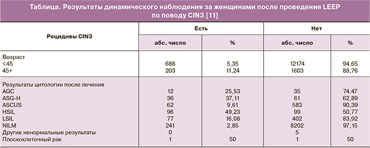 Анализ данных литературы, посвященный контролю за состоянием шейки матки после хирургического вмешательства, показал, что чрезвычайно важным является динамическое наблюдение за данным контингентом женщин. Так, в рамках исследования Brenna E. Swift et al. (2020) были проанализированы результаты 14 668 женщин, которым провели LEEP по поводу CIN3. У 891 пациентки (6,1%) был выявлен рецидив заболевания. Анализ показал, что, по данным цитологического исследования, в 49,5% наблюдений диагностирован HSIL, в 37,1% случаев – атипичные плоскоклеточные клетки, не исключающие HSIL (ASC-H), у 22,6% пациенток – атипичные железистые клетки (AGC), у 15,9% – плоскоклеточные поражения плоского эпителия низкой степени (LSIL) и в 9,8% случаев – атипичные клетки плоского эпителия неопределенного происхождения (ASCUS) (таблица). При этом наиболее значимыми факторами риска являлись: возраст женщины более 45 лет, при котором риск рецидива составил 11,2% против 5,6% у женщин моложе 45 лет, и наличие ВПЧ 16, 18, 45 генотипов [11]. Авторами сделан вывод о необходимости динамического наблюдения за пациентами после проведения LEEP: риск развития рецидива заболевания при выполнении трех цитологических исследований составил 3,4%, в то время как при одном – 7,1% (рисунок).