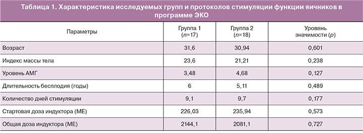 В исследование были включены 35 пациентов с нормальным ответом яичников. Критериями включения были: возраст пациенток от 22 до 38 лет, регулярный менструальный цикл (25–34 дней), индекс массы тела 18–29 кг/м2, уровень ФСГ≤10 МЕ/л, менее 3 неудачных предыдущих попыток ЭКО. Всем пациентам проводили стимуляцию яичников с рекомбинантным фолликулостимулирующим гормоном (ФСГ) (гонал-ф, Serono Merck, Швейцария; или пурегон, Organon, Нидерланды) и/или очищенным человеческим менопаузальным гонадотропином (менопур, Ferring, Швейцария) со 2-го дня менструального цикла. Стартовые дозы индуктора варьировали от 118,5 МЕ до 300 МЕ в день. Первый ультразвуковой контроль выполняли после 5 дней стимуляции и корректировали дозу индуктора в зависимости от реакции яичников. При достижении лидирующих фолликулов размеров 14 мм начинали ежедневное использование ант-ГнРГ 0,25 мг/сутки (цетротид, Serono Merck, Швейцария) для предупреждения преждевременного пика ЛГ и продолжали до дня введения триггера овуляции. При наличии в яичниках трех или более фолликулов диаметром ≥17 мм вводили триггер овуляции в дозе 10 000 МЕ чХГ (прегнил, Organon, Нидерланды) в группе 1 (n=17) или 0,2 мг трипторелина (диферелин, Ипсен Фарма) в группе 2 (n=18). Примерно через 35–36 ч после введения триггера производили трансвагинальную пункцию яичников. Перенос эмбрионов производили на 3-и или 5-е сутки культивирования эмбрионов после пункции фолликулов. Всем пациентам, которым был произведен перенос эмбрионов, назначали поддержку лютеиновой фазы: пациентам группы 1 – в виде микронизированного прогестерона – 600 мг в сутки (утрожестан, Besins, Iscovesco, С.т.С., Петах-Тиква, Израиль) начиная со следующего дня после пункции фолликулов, пациентам группы 2 – препарат чХГ в дозе 1500 МЕ в день пункции фолликулов, а также препарат микронизированного прогестерона 600 мг в сутки (утрожестан) и 6 мг эстрадиола валерата (прогинова; Schering) ежедневно.