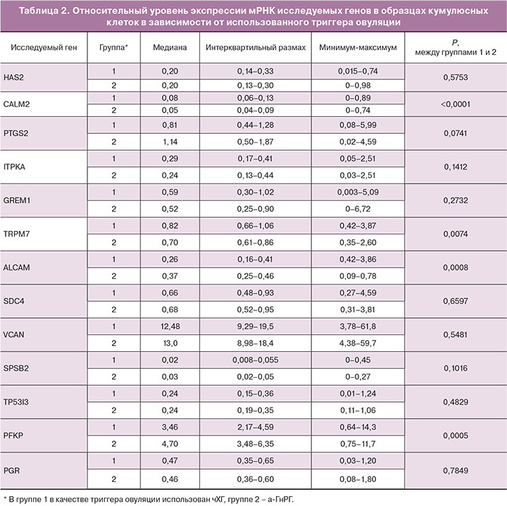 Различия в экспрессии генов кумулусными клетками в группах триггеров а-ГнРГ и чХГ были выявлены среди генов CALM2 (0,08 против 0,05; P<0,0001), TRPM7 (0,82 против 0,70; P=0,007), ALCAM (0,26 против 0,37; P=0,0008) и PFKP (3,46 против 4,70; P=0,0005) (табл. 2).