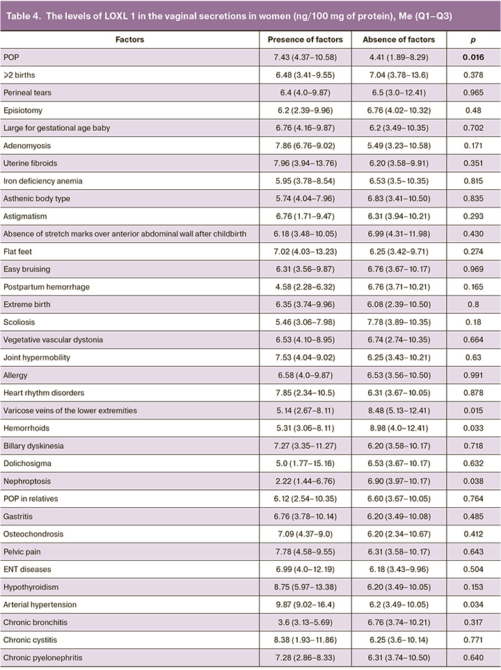 Garcia B. et al. demonstrated the possibility for detecting LOXL1 in the vaginal secretions in pre- and postmenopausal women [21]. They analyzed 48 samples and found this protein in 45 cases. In patients with POP, LOXL1 protein expression was higher compared with women without this pathology. These results can be explained as a compensatory protein expression increase in response to formation of altered elastic fibers [20]. In our study, LOXL1 was detected in all samples. Table 4 represents the quantitative indicators of LOXL1 in women with and without POP, taking into account the somatic pathology and the features of obstetric and gynecological anamnesis, and the presence of markers of connective tissue dysplasia.