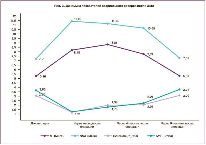 Изменения функционального состояния яичников, вызванные операцией ЭМА, носят более глубокий и длительный характер по сравнению с изменениями после операции ГРС. Таким образом, для функционального состояния яичников операция ЭМА является менее щадящим вмешательством, чем ГРС. Наши данные в основном совпадают с данными литературы о том, что ЭМА оказывает негативное влияние на овариальный резерв яичников и, следовательно, приводит к снижению фертильности женщин по крайней мере в течение 1 года после операции [21, 22].