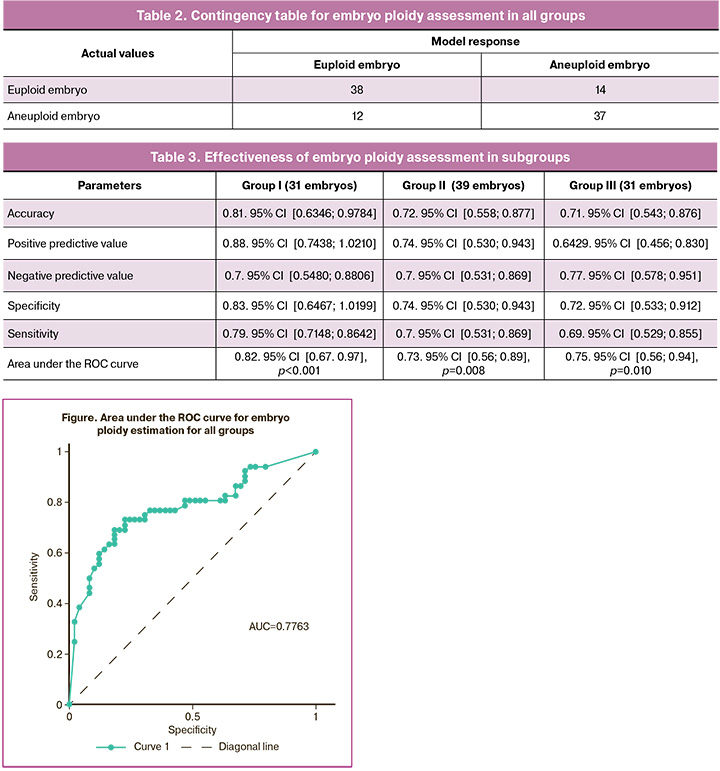 Results: A total of 117 blastocysts were obtained, of which 101 were subjected to PGT-A and automated analysis: 31 blastocysts from women under 35 years of age (mean age 30.7 years), 39 blastocysts from women aged 35–39 years (mean age 37.4 years), and 31 blastocysts from women over 40 years of age (mean age 42 years). According to the PGT-A results for 101 embryos, the euploidy rate was 51.5%. The accuracy, positive predictive value, negative predictive value, sensitivity, specificity, and area under the ROC curve were 0.74, 0.76, 0.73, 0.73, 0.76, and 0.78, respectively. The most significant results were observed in patients aged < 35 years.