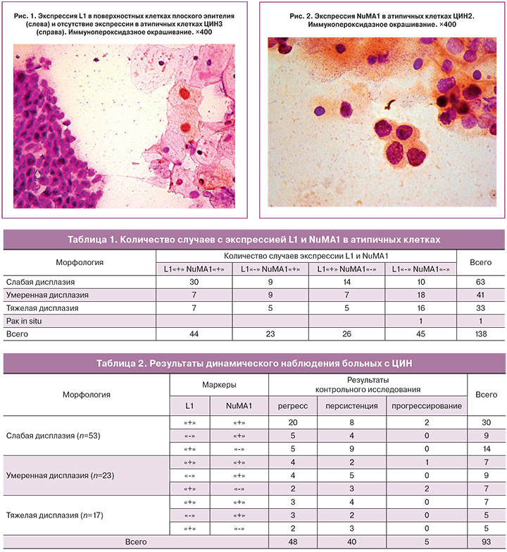 - Наибольшее количество случаев регресса ЦИН – 61,4% отмечено при экспрессии атипичными клетками L1 и NuMA1, персистенции ЦИН – 57,7% – при экспрессии L1.
